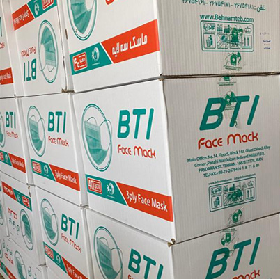 three layer medical mask is used for preventing and protection against pathogens, pollutions, and viruses, and its meltblown layer prevents the entrance of existing dust and viruses in the air to the respiratory tracts. These masks can be ordered and produced in various colors and are available to the public at treatment centers, hospitals, factories, and food and health preparing centers in order to protect them against the viruses. BTI masks are produced in fifty-piece vacuumed packs and two-thousand-piece cartons, which are kept in heated places (for sterilization) for 72 hours. Afterwards, they are distributed to the pharmacies and stores and are available to the public.